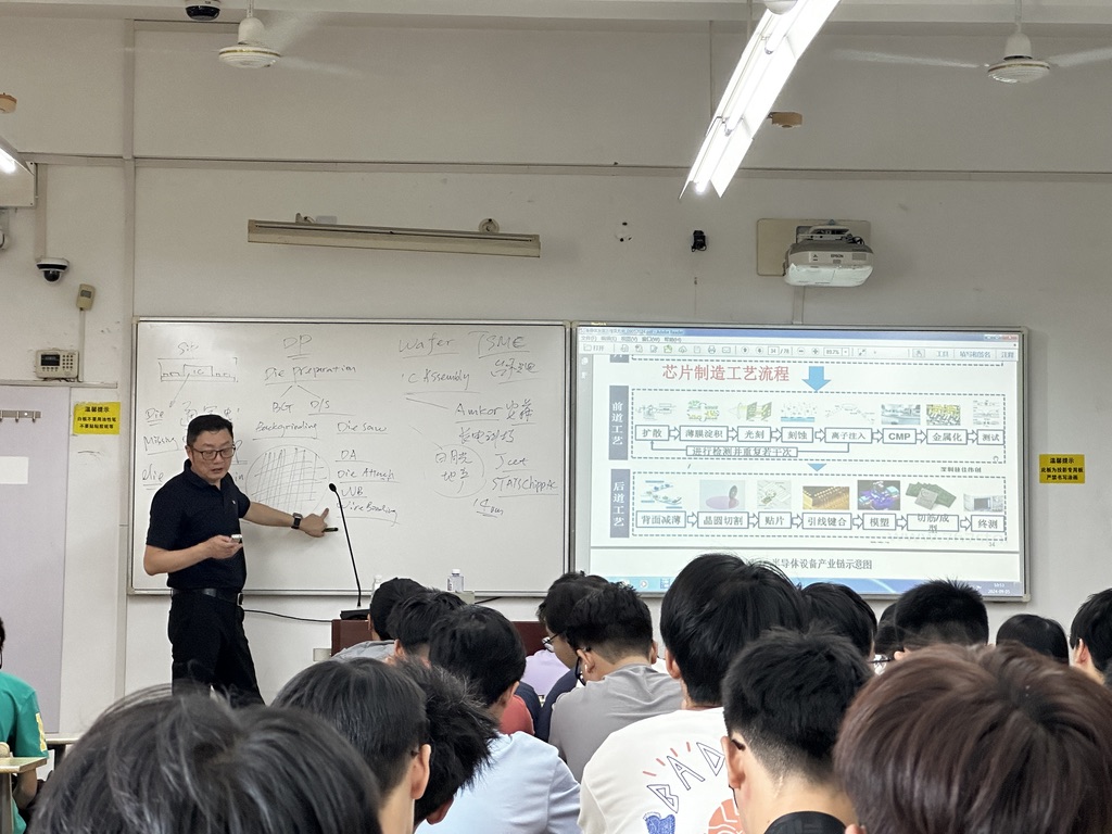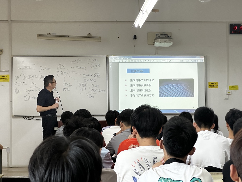 随后瞿总对SiP封装的概念、应用及工艺流程做了简单介绍。讲解了SiP封装与IC封装的相同及不同之处。同时瞿总也为电子封装专业的同学们树立信心,着重强调了专业知识的储备与个人素养提升的重要性,耐心地解答员工们对于企业环境和就业发展方向方面的疑惑,深化企业对员工在综合素质和专业技术方面的具体期望,为大家提供了切实可行的指导。课堂上的氛围积极向上,同学们都很认真地听讲并参与讨论。