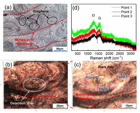 含0.5%石墨烯的15-5PH/石墨烯复合材料内GNPs的光学显微和拉曼光谱表征