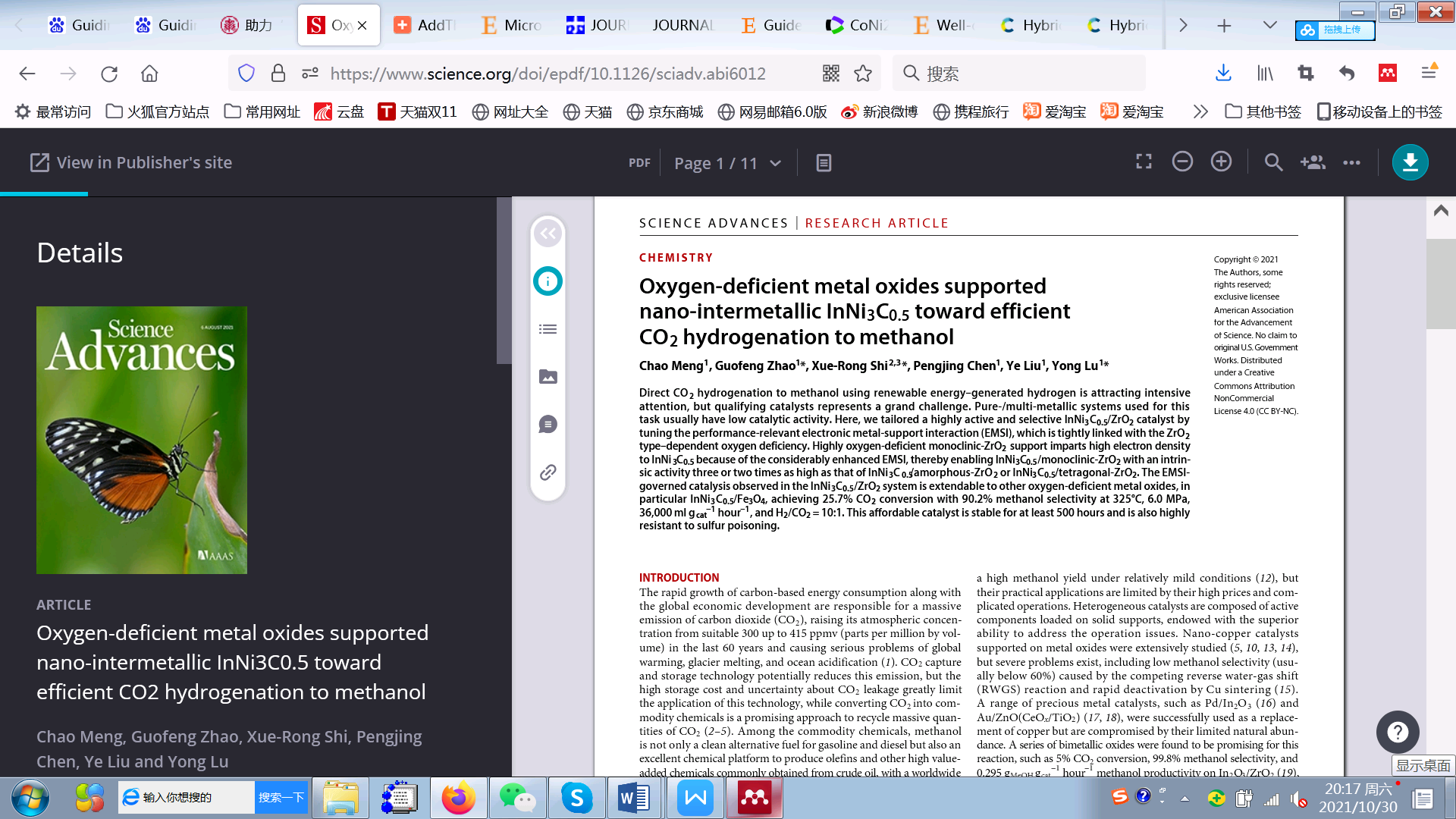 近期,伟德国际bevictor史雪荣副教授与华东师范大学化学与分子工程公司、上海市绿色化学与化工过程绿色化重点实验室路勇教授课题组在二氧化碳CO2加氢高效合成甲醇的研究中取得重要进展,相关成果“Oxygen-deficient metal oxides supported nano-intermetallic InNi3C0.5 towards efficient CO2 hydrogenation to methanol”发表于Science出版集团子刊《Science Advances》上(2021, 7(32), DOI: 10.1126/sciadv.abi6012)。博士生蒙超为论文第一作者,伟德国际bevictor官方网站史雪荣副教授、华东师范大学路勇教授、赵国锋副研究员为论文共同通讯作者。