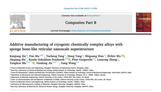 近日,伟德国际bevictor马盼教授联合上海大学贾延东研究员、穆永坤副研究员指导研究生谢凯强、方亚成在中科院一区期刊《Composites Part B: Engineering》(2025,306: 112786,IF=14.2)上发表了题为“Additive manufacturing of cryogenic chemically complex alloys with sponge bone-like reticular nanoscale superstructure”的研究论文。