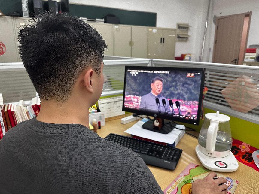 上午9点阅兵仪式正式开始。辅导员代表和员工代表们分别在各自的工位观看直播。师生们在阅兵中深刻感受江山壮丽、人民豪迈的宏伟气象。
