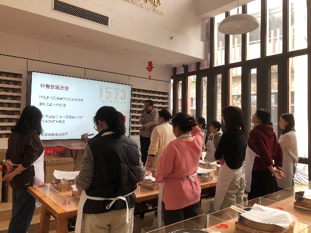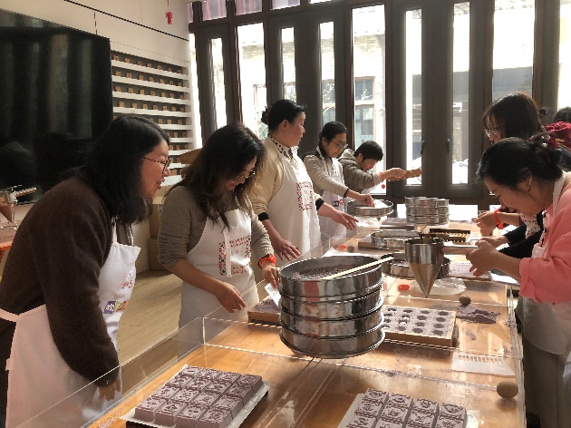 在非遗传承人的带领下,女教职工们深入了解叶榭软糕的历史渊源与制作工艺。叶榭软糕作为上海市非物质文化遗产代表性项目,起源于明代,以选料考究、工序精细、口感软糯著称,承载着松江地区深厚的农耕文化与民俗记忆。从筛粉、入模、压坑、填馅、覆粉、脱模,大家认真聆听,细致操作,在方寸之间感受非遗技艺的匠心之美。