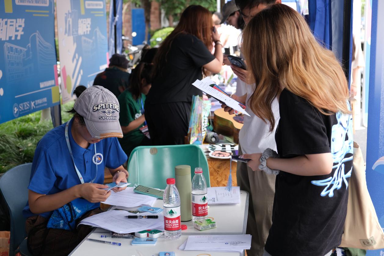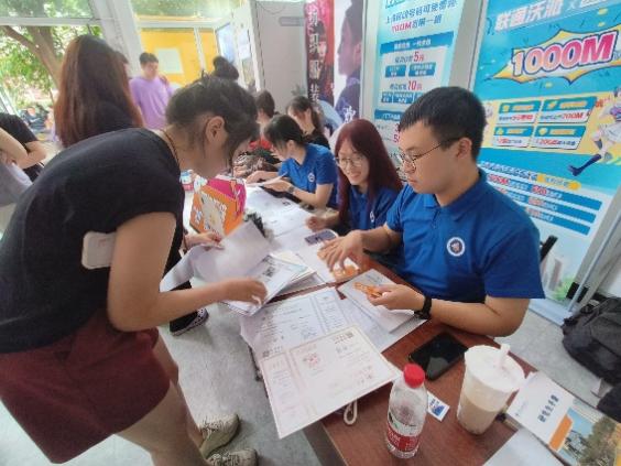 迎新现场,学长学姐按班级为新生们提供报到服务,领校园卡、银行卡,发放公司为同学们定制的礼物,跨越山海,我们终于相遇。