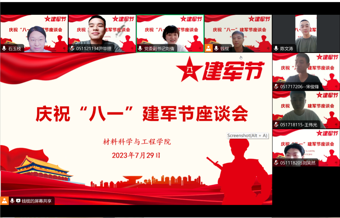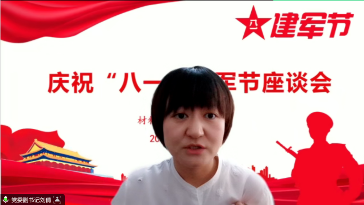 2023年是中国人民解放军建军96周年,值此”八一”建军节来临之际,伟德国际bevictor于7月29日上午举办庆祝“八一”建军节座谈会,通过腾讯会议隔屏向公司全体在役以及退役复学老员工致以节日的问候。公司党委副书记刘倩、学工组长石玉枝、征兵辅导员钱栊、在役以及退役复学老员工士兵线上参会,会议由征兵辅导员钱栊主持。